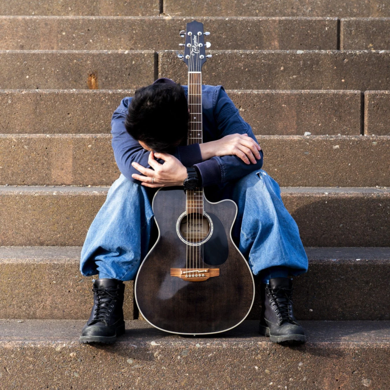 コンクリートの階段に座り、アコースティックギターを抱えて物思いにふける歌代隼人さん